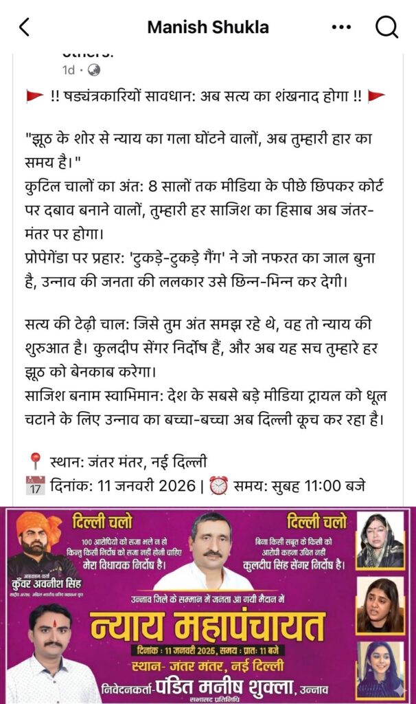 बताया गया है कि सुप्रीम कोर्ट द्वारा कुलदीप सेंगर की जमानत पर रोक लगाने को उनके समर्थक तथा माखी गांव के तमाम लोग इस मीडिया ट्रायल का परिणाम मान रहे हैं। जिसके चलते इन लोगों ने कुलदीप के पक्ष में सड़क पर उतरने की रणनीति बनाई है और इसके लिये सोशल मीडिया का सहारा लिया जा रहा है। उन्नाव जनपद में सोशल मीडिया के कई ग्रुपों में एक भाजपा सभासद के प्रतिनिधि की तरफ से एक पोस्ट डाली जा रही है जिसमें पूर्व विधायक कुलदीप सिंह सेंगर को निर्दोष बताकर इसे मीडिया ट्रायल का परिणाम बताते हुए 11 जनवरी को दिल्ली के जंतर-मंतर पर धरना देकर अपनी बात रखने की बात कही जा रही है। जंतर-मंचर पर धरना देकर मीडिया का रुख अपने पक्ष में करने के लिये कम से कम पांच सौ लोगों को उन्नाव से दिल्ली ले जाने की तैयारी की गई है।