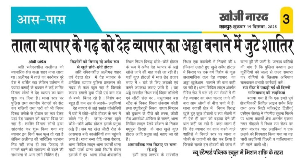 अलीगढ। ताला नगरी के रूप में पूरे देश में प्रसिद्ध अलीगढ़ को में देह व्यापार को बढ़ावा देकर इन ऐतिहासिक जनपद की साख को बट्टा लगाने वालों पर पुलिस ने बड़ी कार्रवाई की है। पुलिस ने जिले के दो प्रमुख होटलों में छापा मारकर देह व्यापार से जुड़े 15 लोगों को गिरफ्तार किया। इनमें सात लड़कियां शामिल हैं। ताला नगरी को कुछ शातिरों द्वारा देह व्यापार का अड्डा बनाने की खबर करीब एक माह पहले दैनिक खोजी नारद ने प्रकाशित कर पुलिस को इस गंदे व्यापार की तरफ आगाह किया था। खोजी नारद की खबर का असर यह रहा कि करीब 25 दिन तक इस जानकारी पर काम करने के बाद पुलिस ने देह व्यापार के इस अनैतिन काम के संजाल को तोड़ने में काफी हद तक सफलता पाई। देह व्यापार के काम को बढ़ावा देने वालों पर यह कार्रवाई सीओ कमलेश कुमार व एसडीएम महिमा लोधी की अगुवाई में की गई।